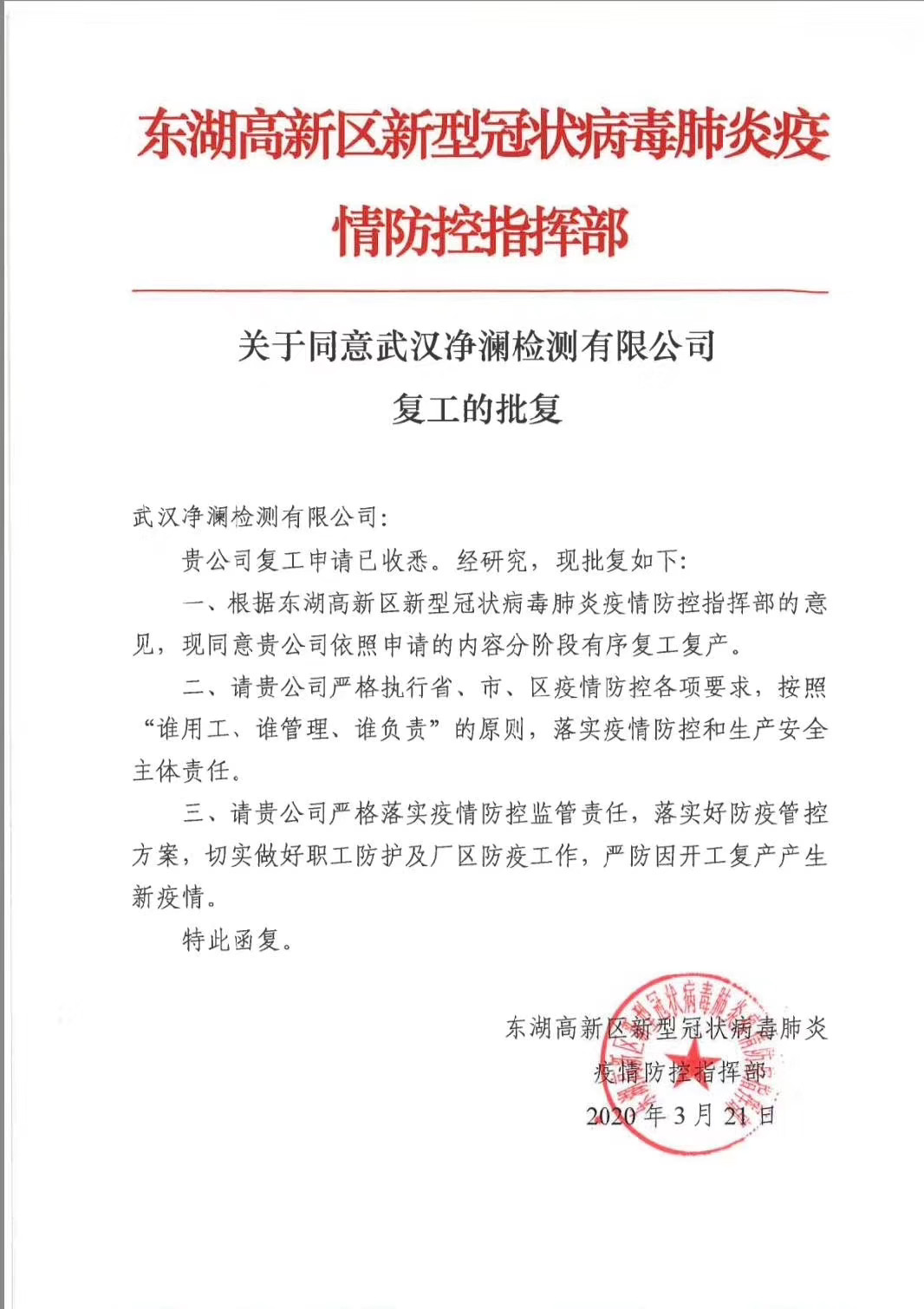 我司復(fù)工申請(qǐng)已批復(fù),現(xiàn)將陸續(xù)返崗,還請(qǐng)各位領(lǐng)導(dǎo)和廣大客戶知曉。正式檢測(cè)工作開始前,有任何需要請(qǐng)隨時(shí)和相關(guān)業(yè)務(wù)工程人員聯(lián)系!感謝您在這段特殊時(shí)間的理解和體諒!